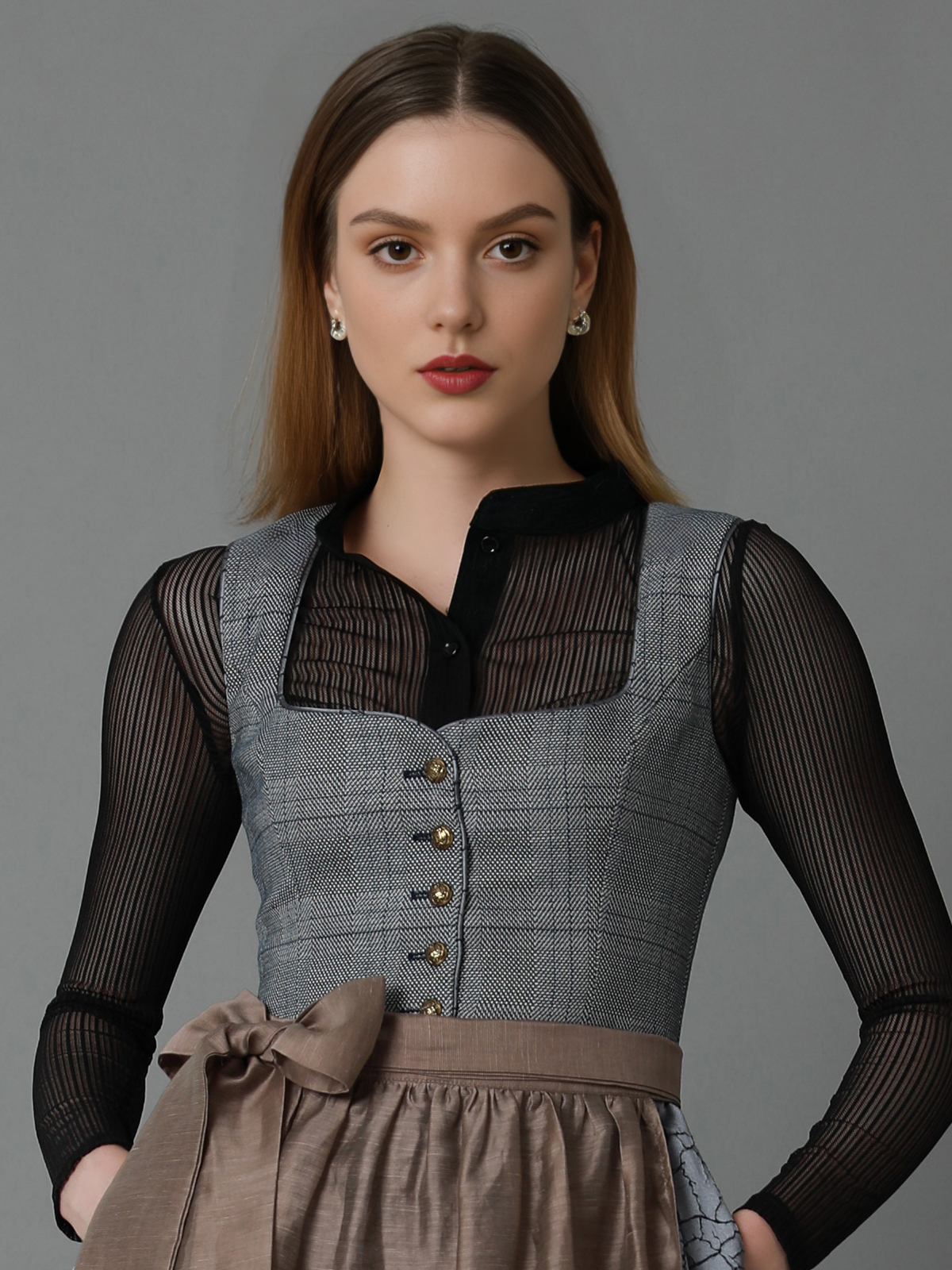 Ein graues Dirndl wie dieses Modell vereint Understatement und Eleganz – ideal für Hochzeiten oder festliche Anlässe.